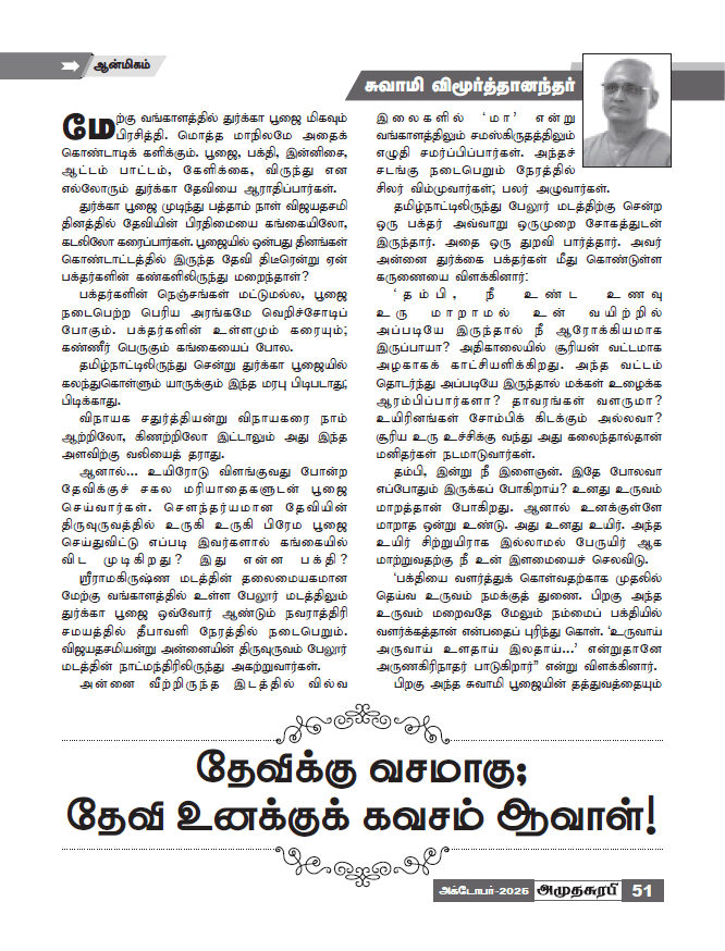 அமுதசுரபி தீபாவளி மலரில் "தேவியின் வசமாகு; தேவி உனக்குக் கவசமாவாள்!" என்ற தலைப்பில் துர்க்கா பூஜை பற்றிய சுவாமி விமூர்த்தானந்தர் எழுதிய கட்டுரை வெளிவந்துள்ளது. அவசியம் வாசித்துப் பாருங்கள்.