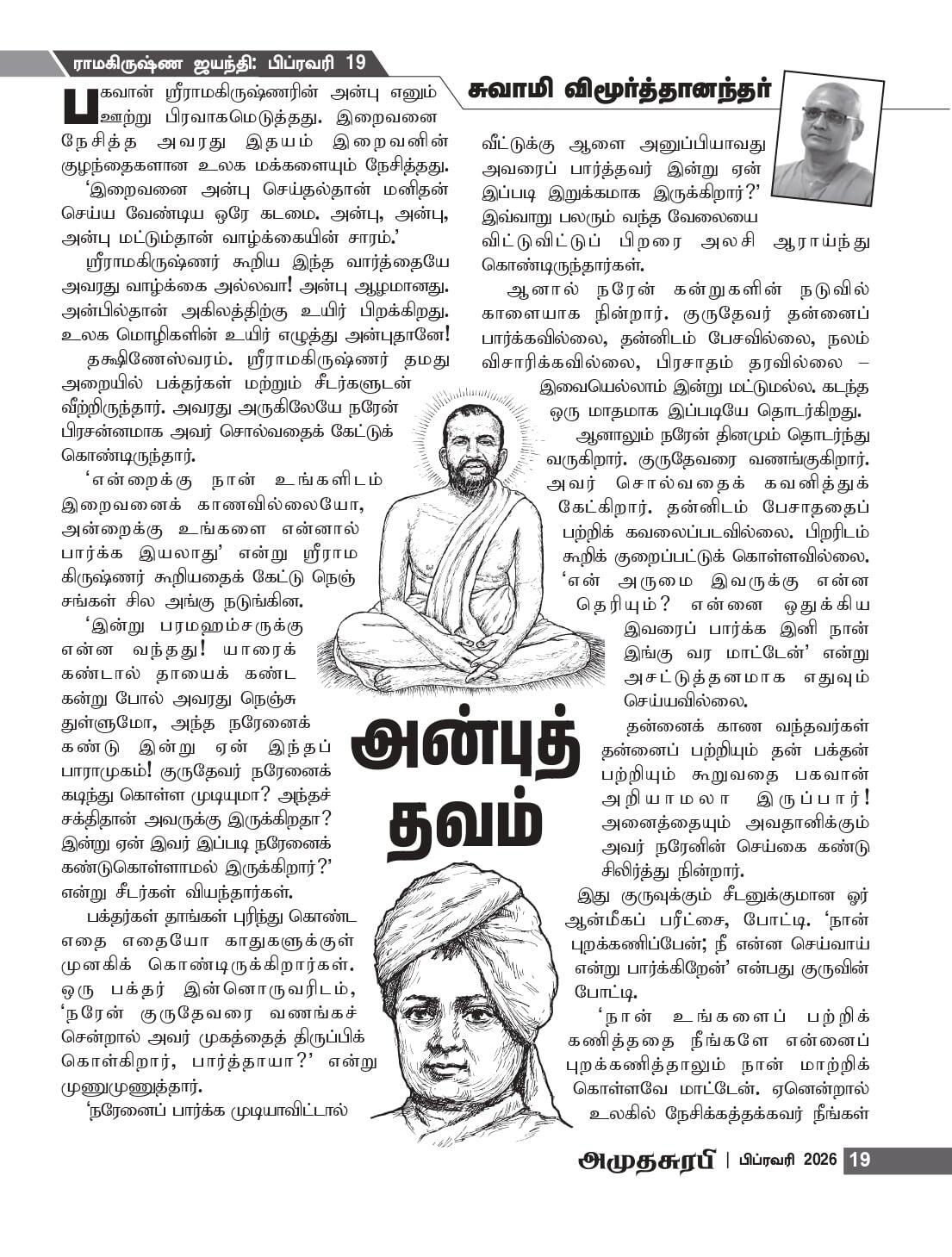 "இறைவனை அன்பு செய்தல்தான் மனிதன் செய்ய வேண்டிய ஒரே கடமை. அன்பு, அன்பு, அன்பு மட்டும்தான் வாழ்க்கையின் சாரம்." ஸ்ரீராமகிருஷ்ணர் கூறிய இந்த உபதேசமே அவரது வாழ்க்கை அல்லவா! அன்பு ஆழமானது. அன்பில்தான் அகிலத்திற்கு உயிர் பிறக்கிறது. உலக மொழிகளின் உயிர் எழுத்து அன்புதானே!
