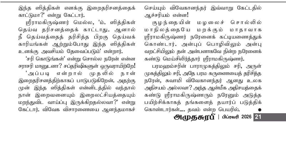 "....அப்படி என்றால் முதலில் நான் இறைதரிசனத்திற்காகப் பாடுபடுகிறேன். அதற்கு முன் இந்த சித்திகள் என்னிடத்தில் வந்தால் நான் இறைவனையும் இறைலட்சியத்தையும் மறந்துவிட வாய்ப்பு இருக்கிறதல்லவா?" என்று கேட்டார். விவேக விசாரணையை ஆனந்தமாகச் செய்யும் விவேகானந்தர் இவ்வாறு கேட்டதில் ஆச்சரியம் என்ன!
