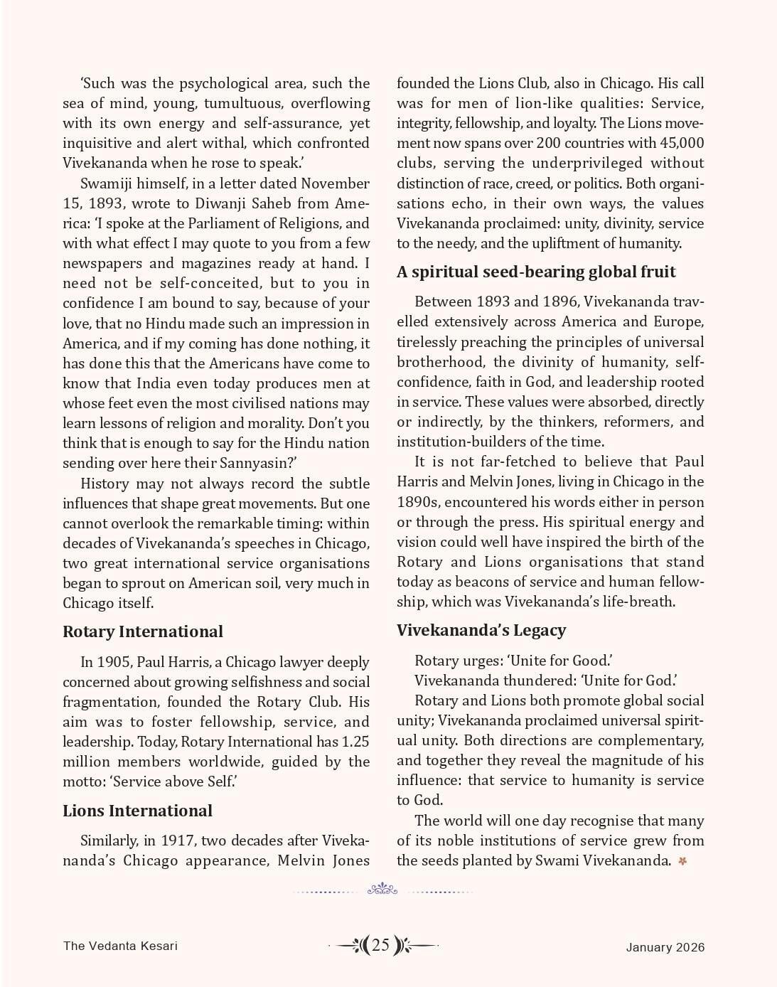 History may not always record the subtle influences that shape great movements. But one cannot overlook the remarkable timing: within a decade of Vivekananda’s speeches in Chicago, two great international service organizations began to sprout on American soil, in very much Chicago itself.