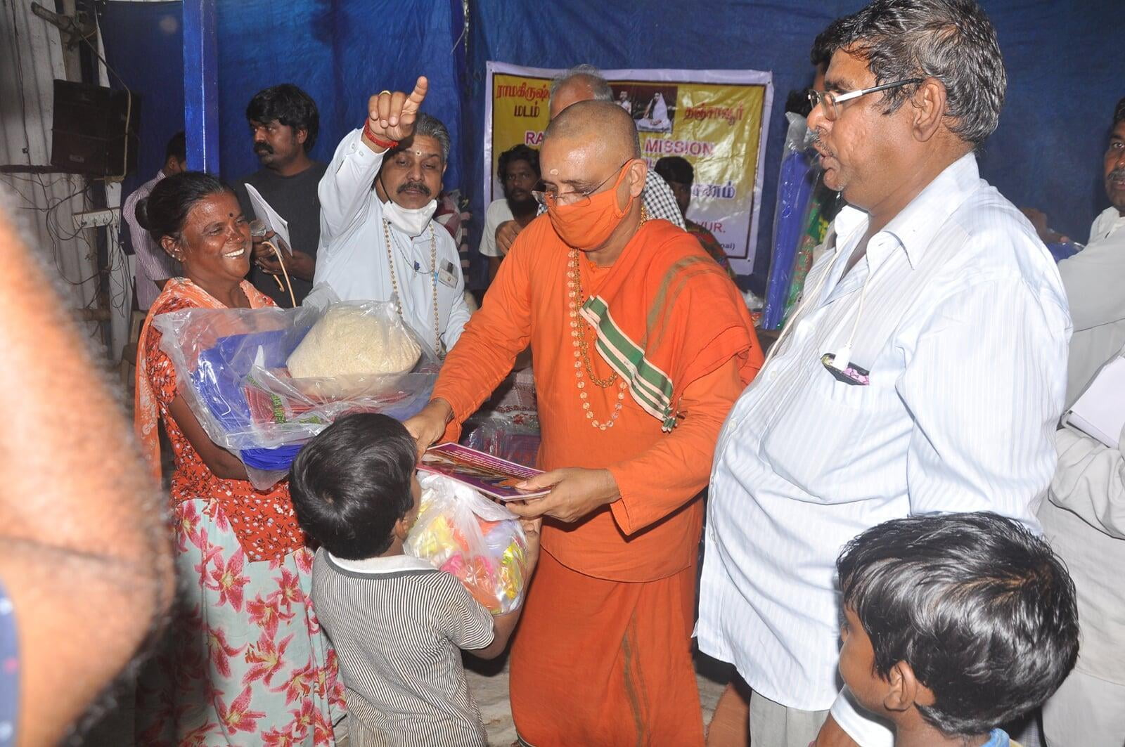 தஞ்சை மாவட்டத்தில் உள்ள திருப்பூந்துருத்தியில் இரண்டு தினங்களுக்கு முன்பு தீ விபத்து ஏற்பட்டது. சுமார் 12 குடிசைகள் சாம்பலாயின. அவர்களுக்கு உடனடி நிவாரணமாகப் போர்வைகள், குழந்தைகளுக்கான ஆடைகளும் தஞ்சாவூர் ஸ்ரீ ராமகிருஷ்ண மடத்திலிருந்து வழங்குவதற்கு 27.8.21 அன்று இறைவன் அருள் பாலித்தார்.