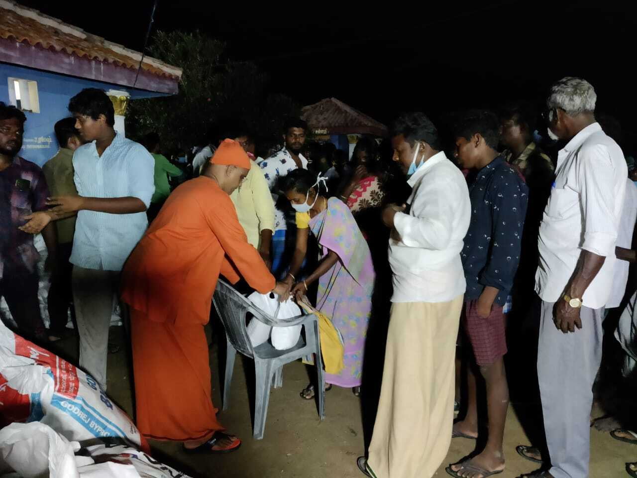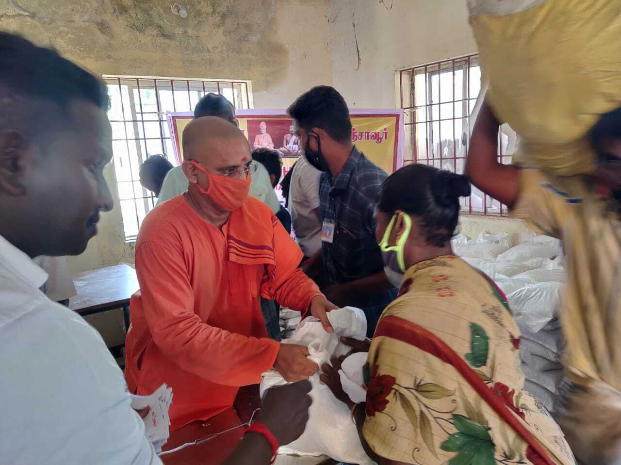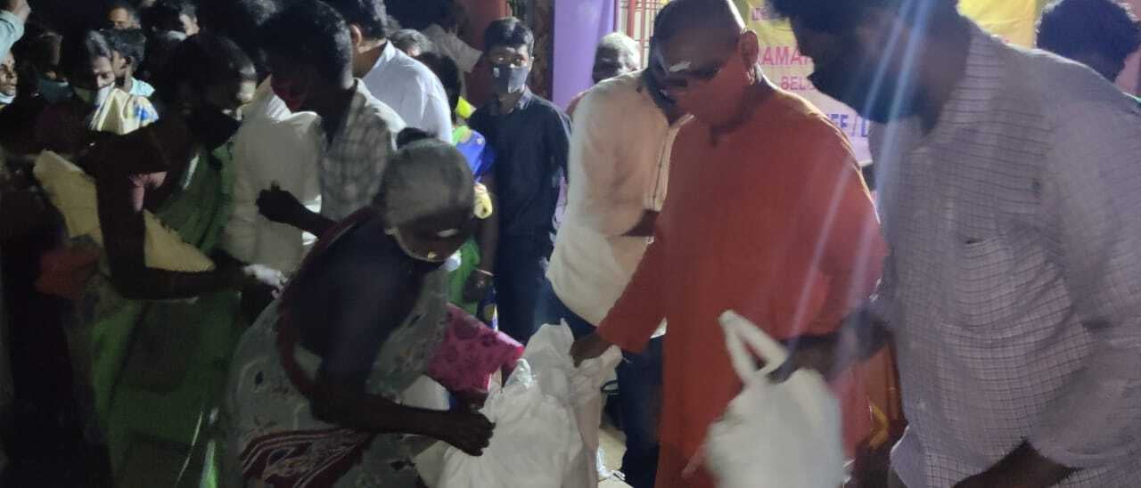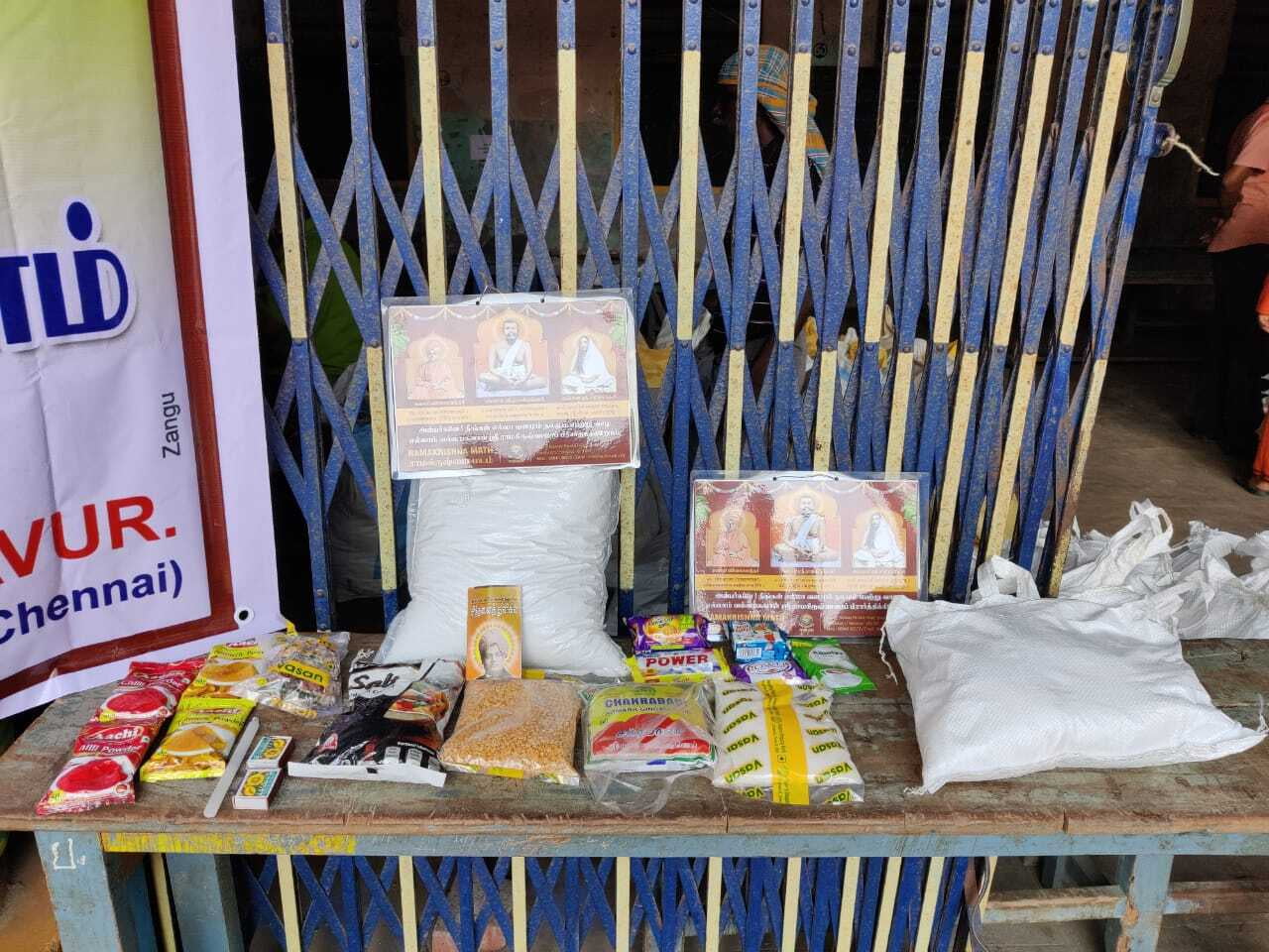 The relief operation was inaugurated by Thanjavur district collector. In a phased manner distribution is being done. Along with groceries we distribute a laminated picture of the Holy Trio and a book of Swamiji to all. ZOHO corporation has supported financially to this great service.