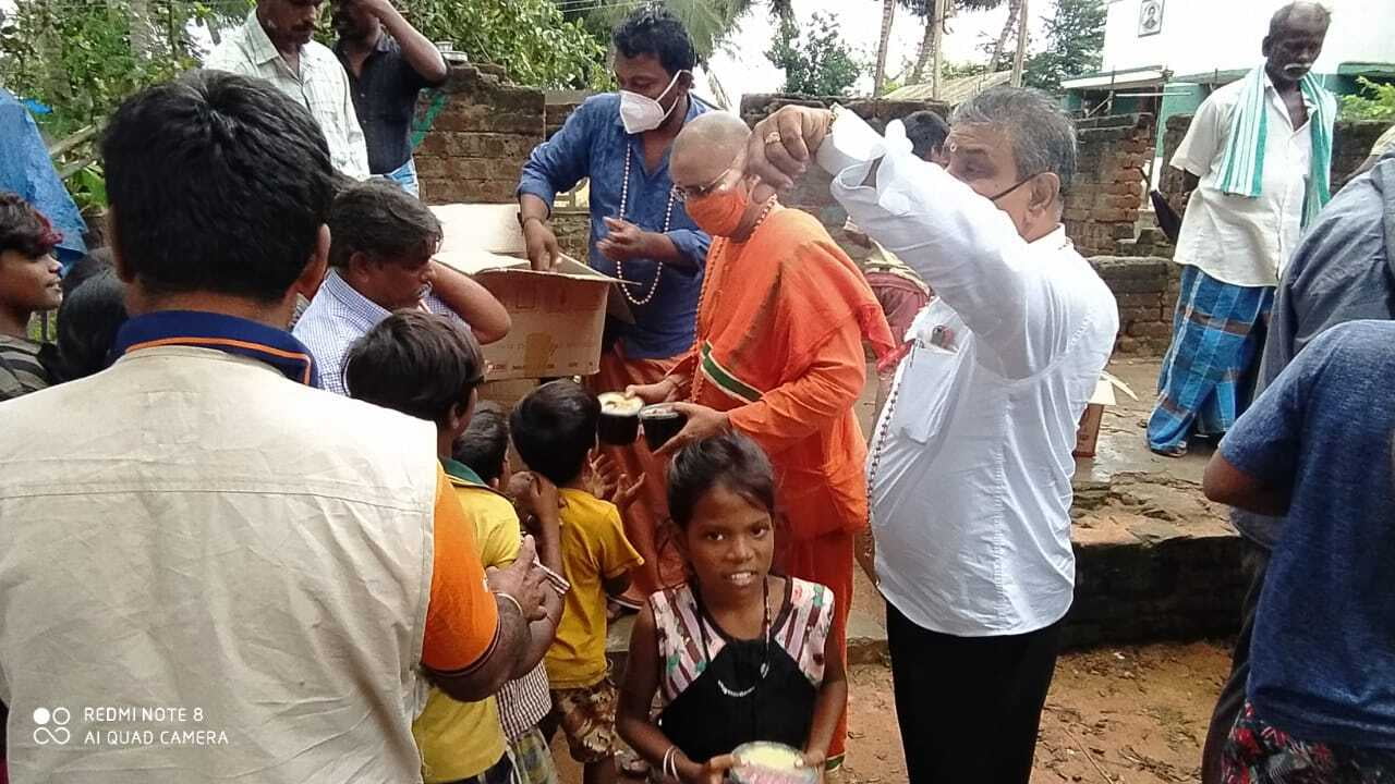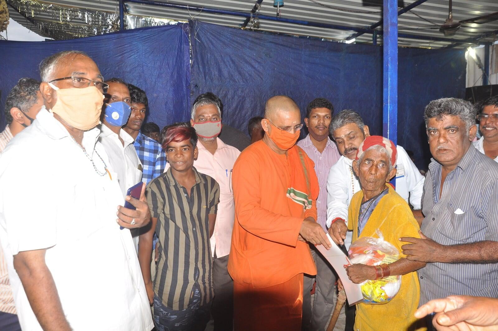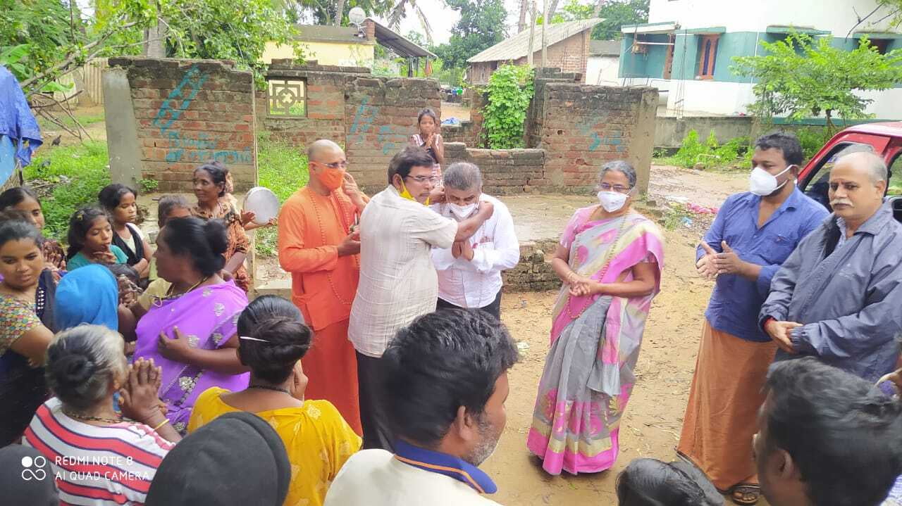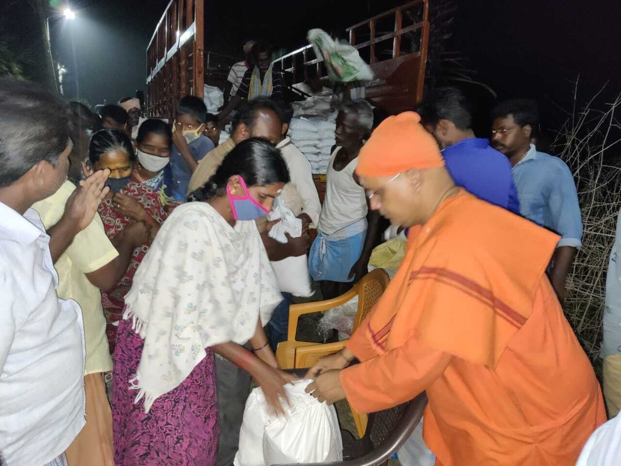 The relief operation was inaugurated by Thanjavur district collector. In a phased manner distribution is being done. Along with groceries we distribute a laminated picture of the Holy Trio and a book of Swamiji to all. ZOHO corporation has supported financially to this great service.